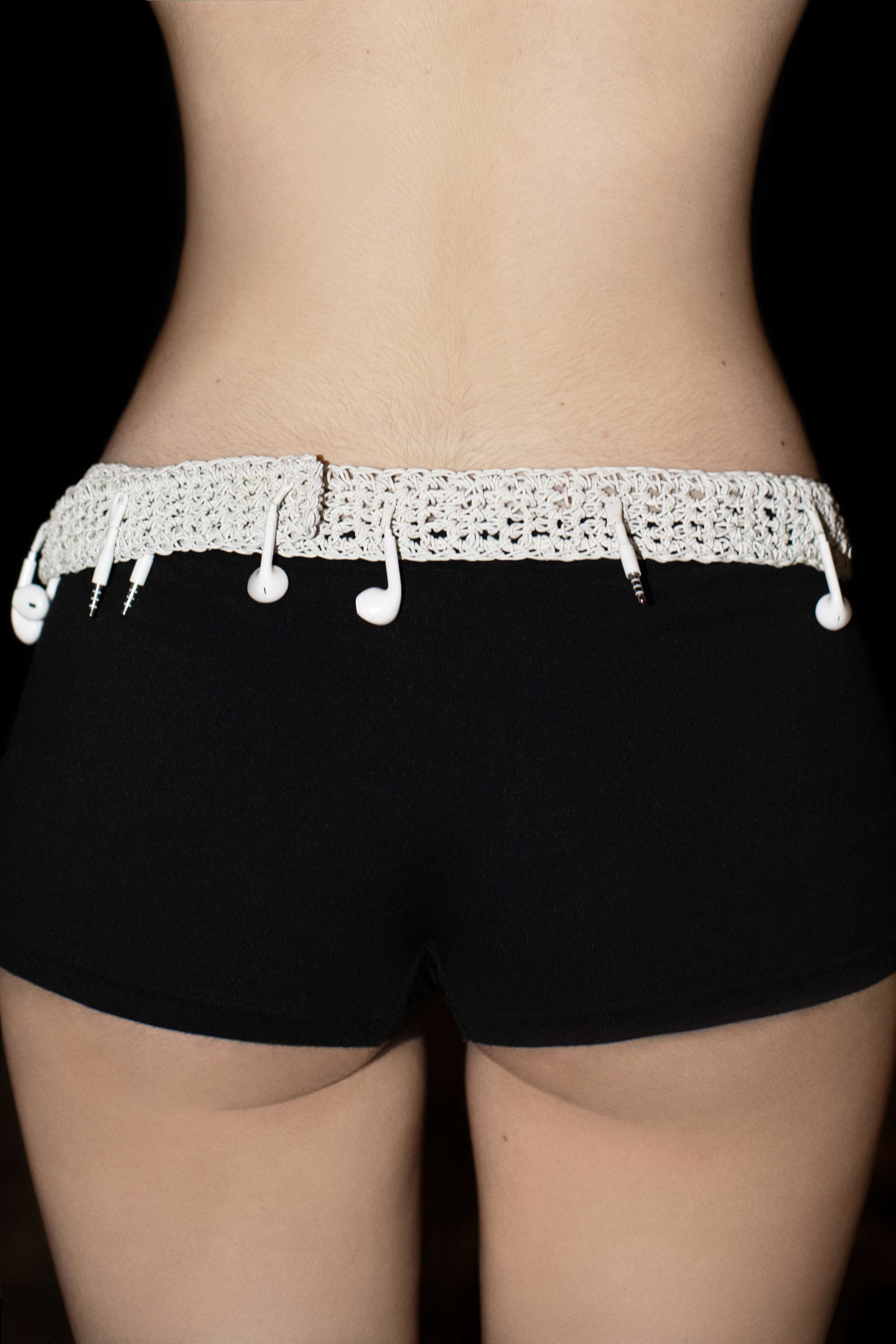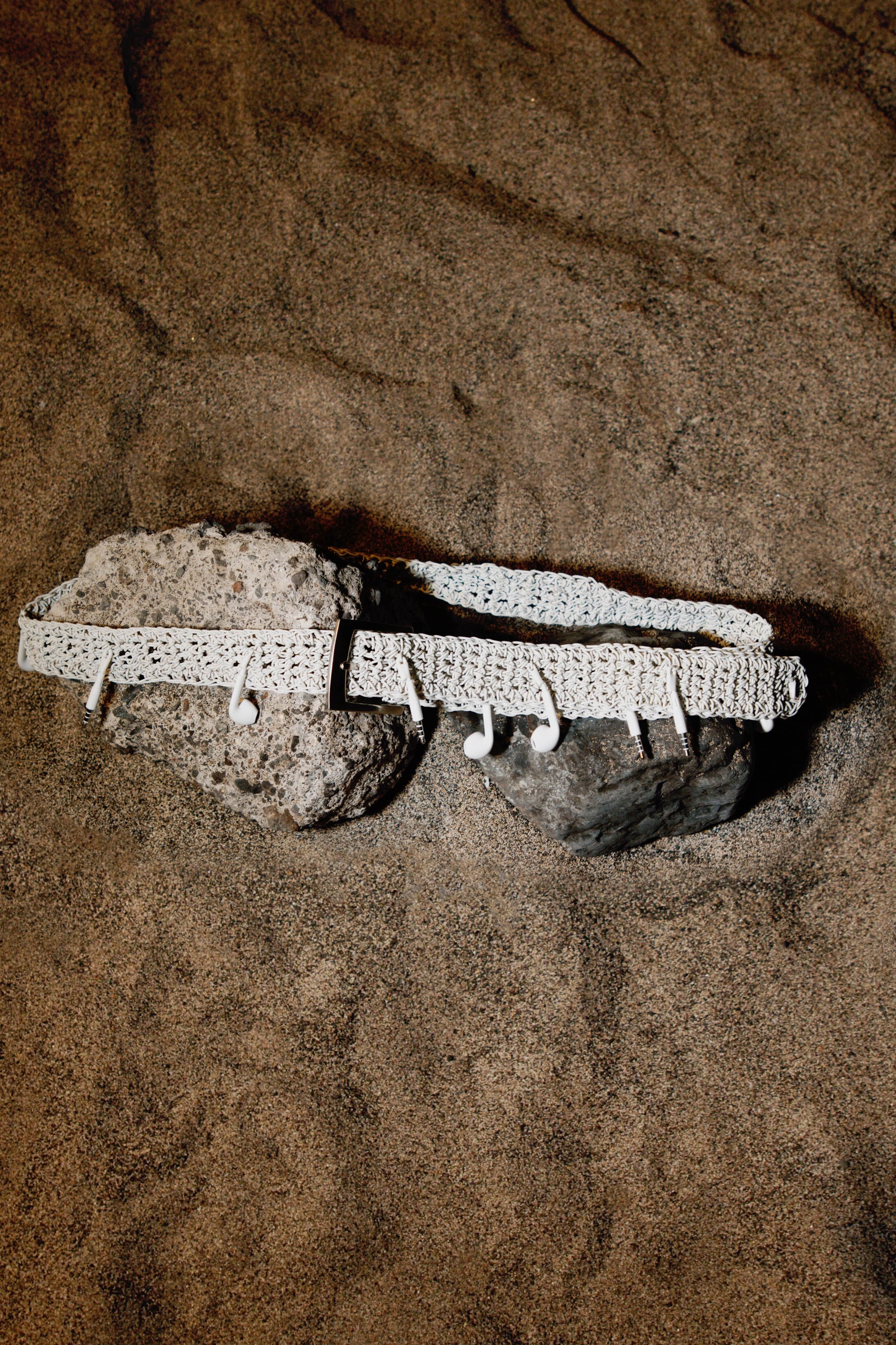 Hand-crocheted from recycled earphones and cables, this sculptural unisex belt reimagines electronic waste into a wearable form of resistance.